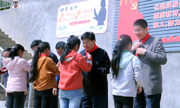和平小学学生代表为国文清一行系上鲜艳的红领巾